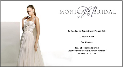 You can stroll through the showroom of Monica's Bridal and find an array of exclusive national and international bridal gowns, dresses for mothers, bridesmaids and guests. We offer shoes head pieces, and every accessory imaginable. We highlight the artistry of design in bridal fashion, and showcases the personality of individual designers as it comes out in their gowns. Monica's Bridal offers an unparallel wedding gown expertise and tailors bridal fashion to a body type, personality and destination. Or turn your own fantasy into a reality as we turn your personal sketch or photo into the dress of your dreams. For more than 25 years New Yorkers have been singing praises of Monica's Bridal's breathtaking creations and personalized service and in the Fall will be treated with more gowns, evening dresses and more selection as we move into our new boutique. Our mission has and will be to provide brides with unparallel service and a customized experience. The product sold is not the gown, but the groom's smile when the bride first appears on the wedding day, the whir of camera flashes on the walk down the aisle and the, "you never looked more beautiful" thirty years after upon looking down at a yellowed photograph.